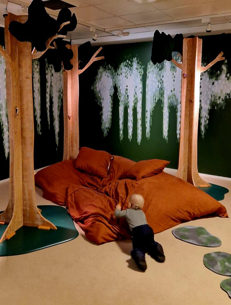 –Vihreä tila kutsuu rauhoittumaan, ja se sopii erityisesti taaperoikäisille. Tilassa on tärkeää muistaa, että taidemuseoon sopii rauhallinen leikki eikä museon tiloissa saa koskaan juosta. Tila on saanut innoituksensa Alvar Aallon suunnittelemasta säveltäjäkoti Villa Kokkosesta.