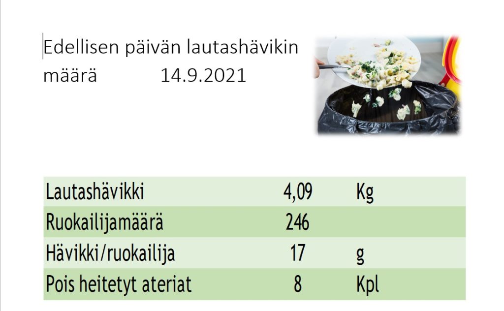 Lautashävikkiä syntyi viikon aikana yhteensä 310,72 kiloa, mikä tekee asiakasta kohden noin 21 grammaa. Yksi ateria kaikkine osineen painaa noin 500 grammaa, joten roskis nielaisi viikossa suurin piirtein 621 ateriaa. Luonnonvarakeskuksen tutkimuksen mukaan linjastoruokailussa lautastähdettä syntyy noin 30 grammaa asiakas, joten tähän suhteutettuna Järvenpään luvut ovat maltillisia.